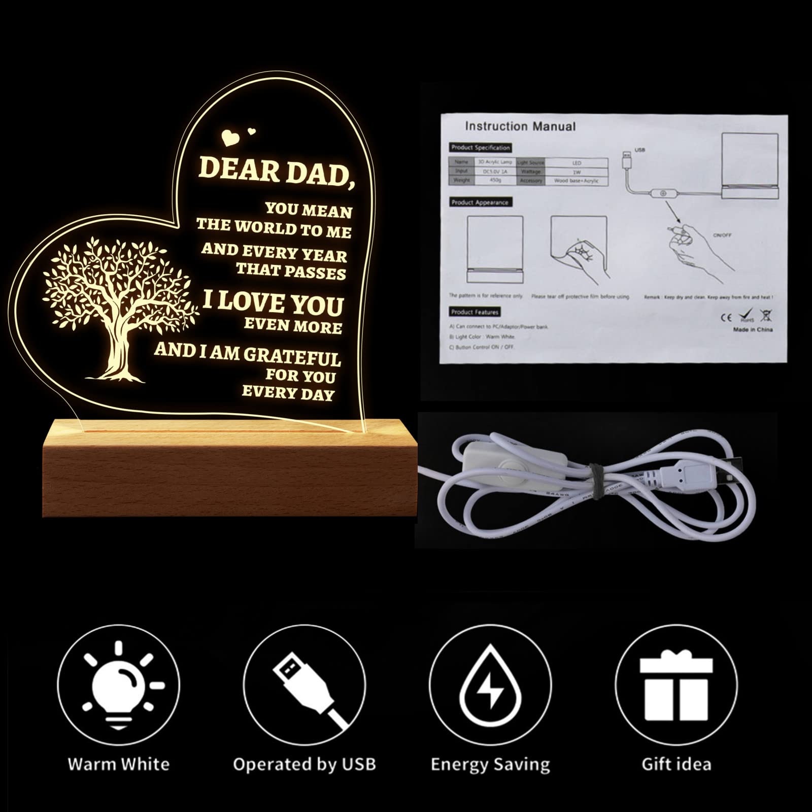 Illuminate your space with the Father's Love 3D Acrylic LED Night Lamp. The intricate design, crafted from premium acrylic, creates a stunning 3D effect that brings warmth to any room. The wooden base adds a touch of elegance and provides stability. A perfect gift for Dad to show your love and appreciation.