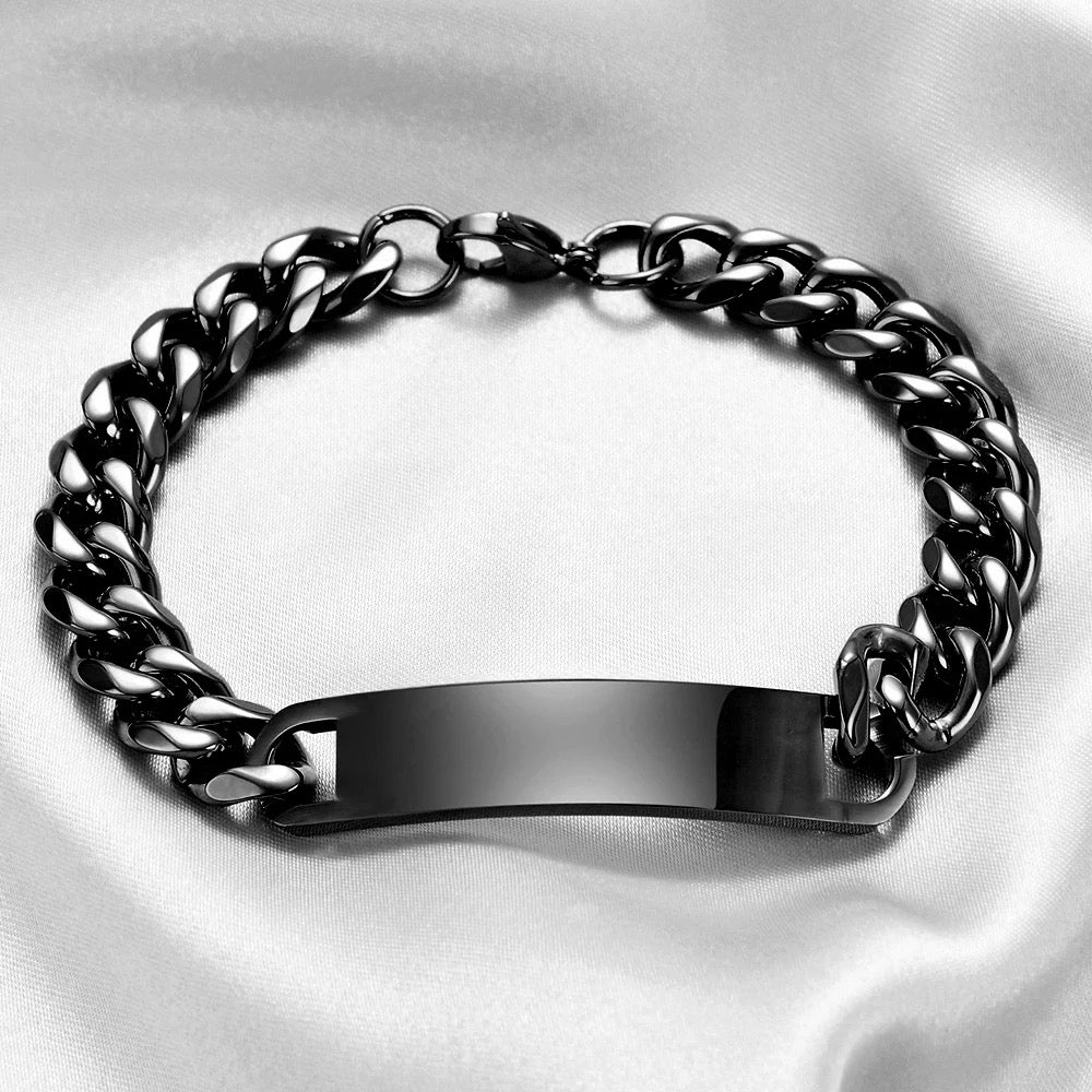 DETAILS BELOW ON ENGRAVING PROCESS, PLEASE READ HERE:ย Enhance your fashion with our high-grade stainless steel Cuban Bracelet, intricately designed and crafted to perfection. With an engraving plate for personalization, choose from 2 sizes and 3 colors for a customized fit for men and women alike. Our bracelet is both water-resistant and Tarnish Proof, providing durability and quality that is suitable for any event.